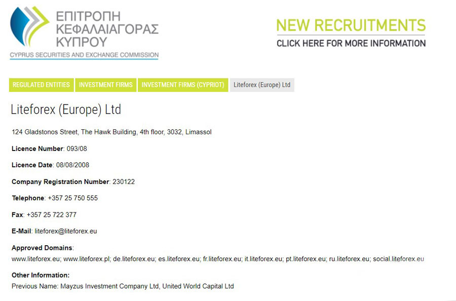 LiteForex Investments Limited، مالک بروکر، از سپتامبر 2013 در جزایر مارشال به عنوان یک شرکت ثبت شده است.
