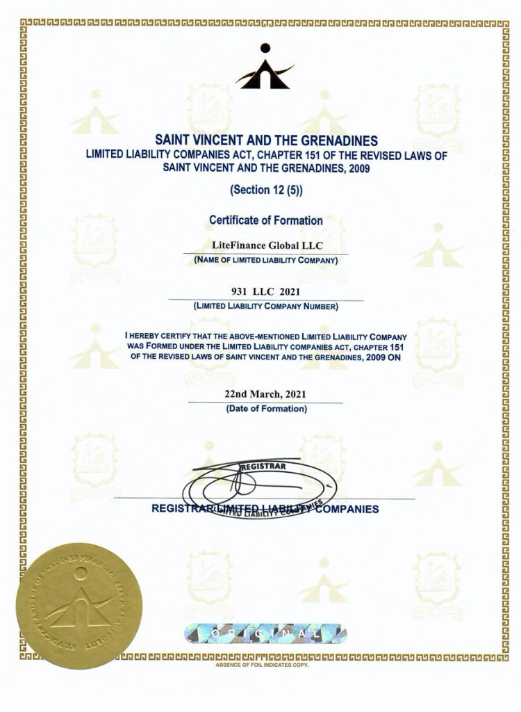 LiteFinance Global LLC در سنت وینسنت و گرنادین ها به عنوان یک شرکت با مسئولیت محدود با شماره ثبت 931 LLC 2021 ثبت شده است.