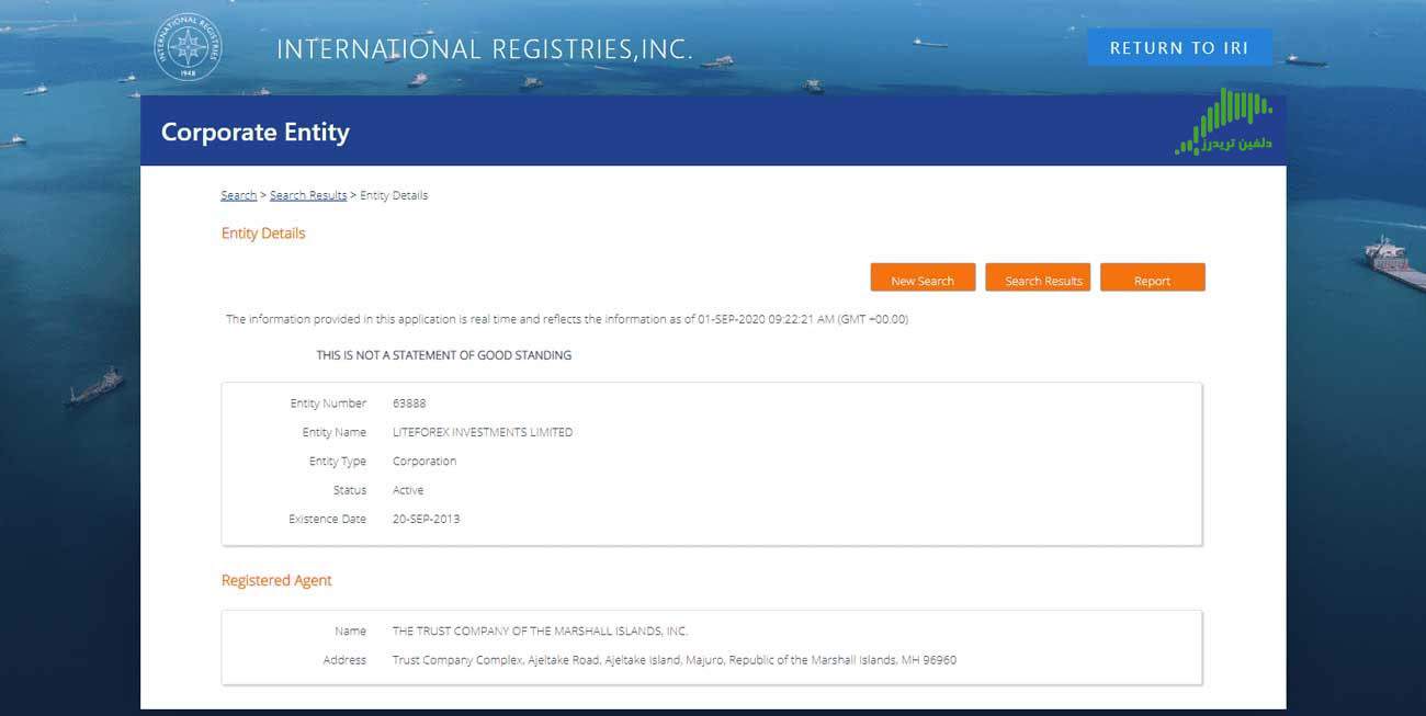 ثبت بین المللی جزیره مارشال، شرکت لایت فارکس را به عنوان شرکتی تأیید میکند که در سپتامبر 2013 تأسیس شده است.