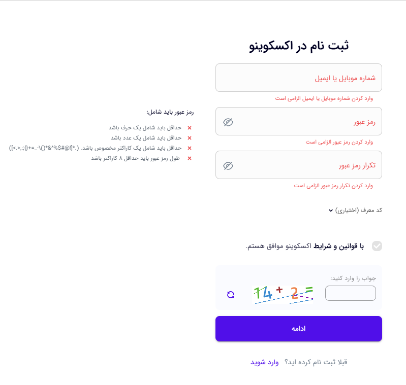 پس از وارد کردن شماره موبایل یا ایمیل و تعیین رمز عبور، لازم است که پس از مطالعه قوانین و شرایط اکسکوینو، با زدن تیک، موافقت خود را اعلام کنید و پس از آن جواب سوال مطرح شده را در آخرین کادر وارد کنید.